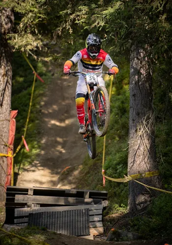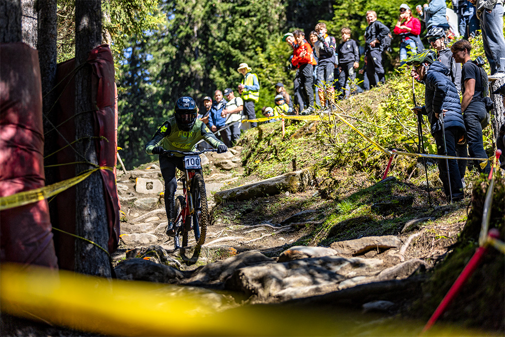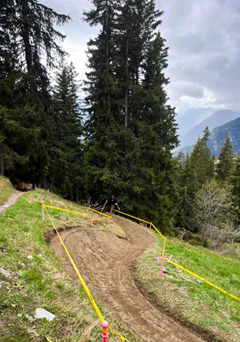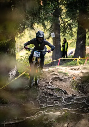 La piste plonge ensuite en forêt pour la majeure partie du parcours. Le tracé devient alors plus technique et sinueux, avec un terrain exigeant composé de racines et de pierriers.